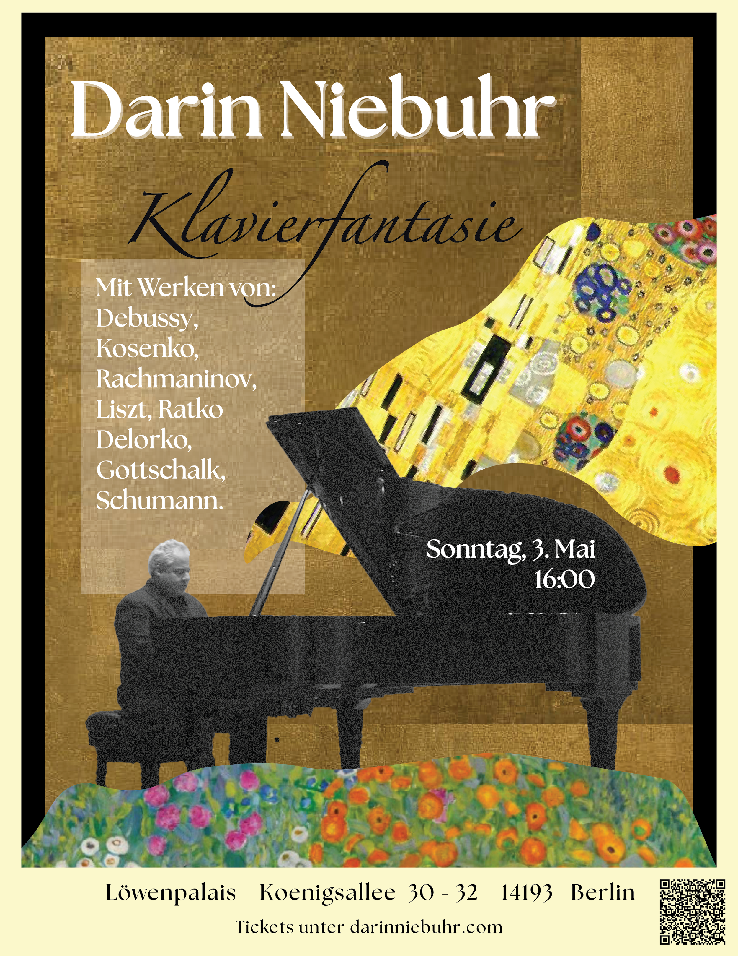 The program features works by: Debussy, Kosenko, Rachmaninov, Liszt, Ratko Delorko, Gottschalk, and Schumann.